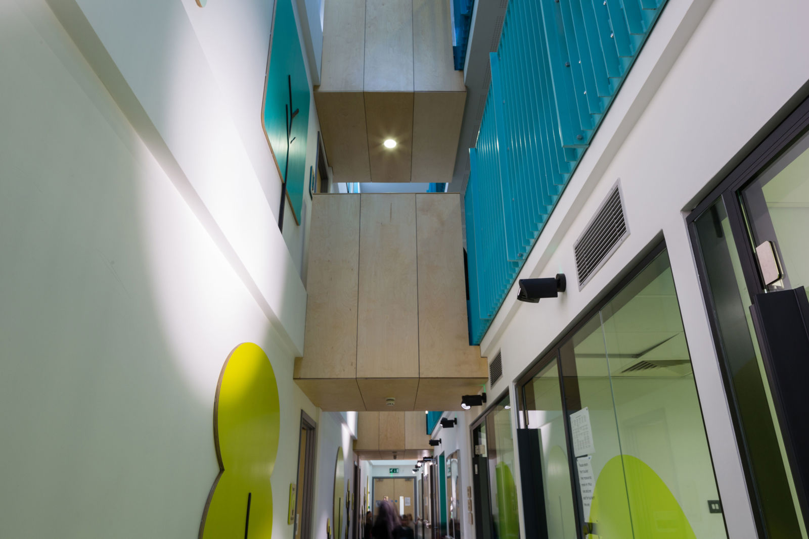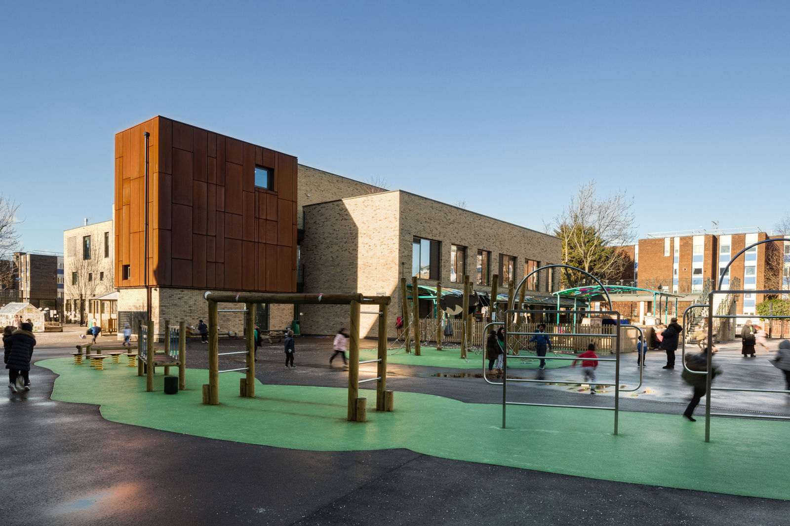 The new school was designed by Architecture Initiative Architects and maximises the potential of the constrained site in a dense urban neighbourhood, incorporating a compact school built upwards rather than sprawling outwards to occupy the minimum footprint and increase the space for landscaped play areas. A series of roof terraces are positioned to maximise daylight penetration into the classrooms, at the top of the building there is an outdoor play deck and mini allotments.
